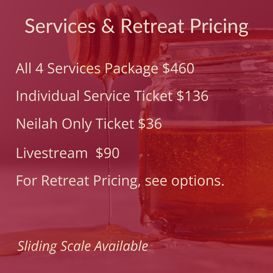A sliding scale is offered to make these services accessible to all - thanks to the donations of our community. Sliding Scale Codes for individual services: $90 tickets: 90TICKET , $54 tickets: 54TICKET. $54 for Livestream: 54TICKETLIVESTREAM. Please email Lisa with any questions Lisa@torahofawakening.com